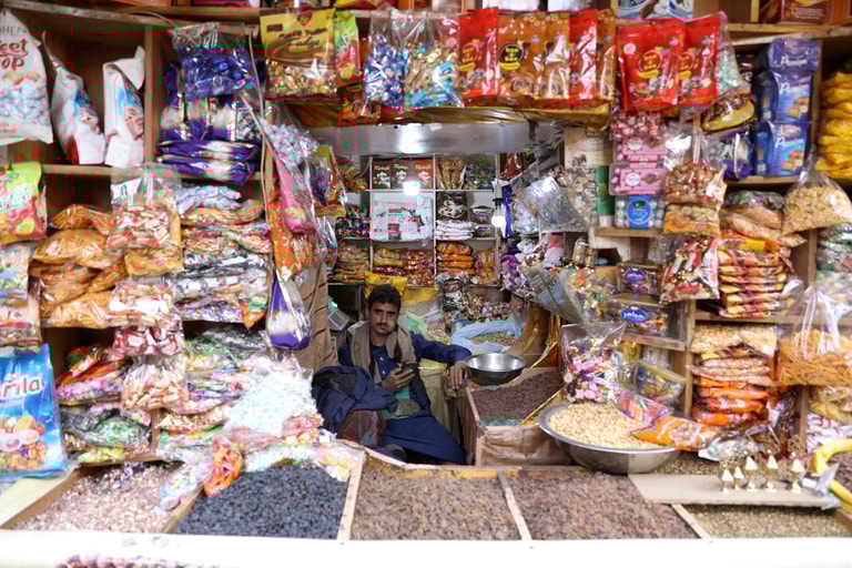 在首都沙那(Sanaa)的老城區,一名甜點小販正在店內等著客人上門。