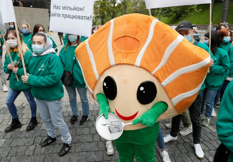 在靠近首都基輔的內閣總部外,餐飲業者和服務人員戴著口罩、敲打鍋碗瓢盆抗議,呼籲當局放寬防疫限制,讓餐廳和咖啡館重新營業。