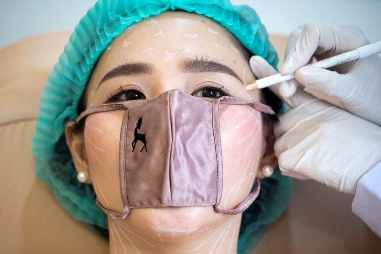 在曼谷的一間醫美診所內,顧客戴起了迷你口罩接受診察。
