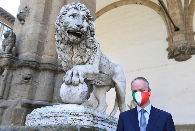在佛羅倫斯的烏菲茲美術館(Uffizi Gallery)前,館長施密特(Eike Dieter Schmidt)戴著義大利國旗色的口罩,開心地站在獅子雕像前宣布重新開館的消息。