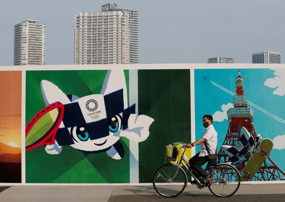 在東京街頭,一名男子騎著單車經過 2020東京奧運的吉祥物未來永遠郎。
