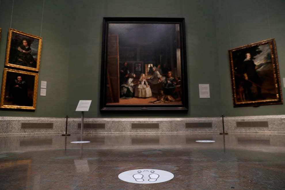 在馬德里的普拉多美術館(Prado museum),維持社交距離的標誌被貼在鎮館之寶——西班牙畫家維拉斯奎茲(Diego Velazquez)的《侍女》(Las Meninas)前的地板。