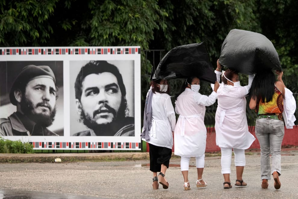 在首都哈瓦那,準備前往科威特協助防疫的古巴醫生拿著黑色塑膠袋檔雨,走過古巴已故總統菲德爾卡斯楚(Fidel Castro)和出生於阿根廷、參與古巴革命的游擊隊領袖切格瓦拉(Ernesto "Che" Guevara)的照片。