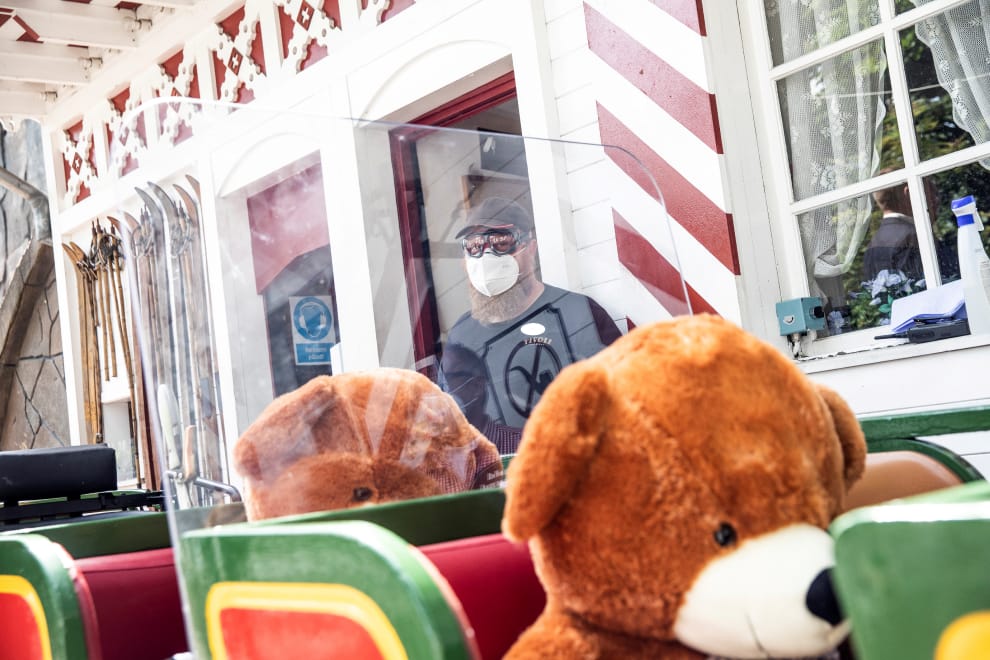 在哥本哈根的TIVOLI(蒂沃利樂園)內,工作人員請來泰迪熊幫忙維持社交距離,替重新營業做好準備。