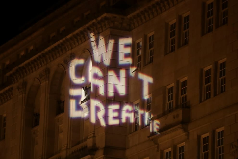 在華盛頓特區靠近白宮的一棟建築物上,抗議民眾投影上「我們不能呼吸了」的標語,聲援日前遭警壓頸致死、在過程中呼喊「我不能呼吸了」的黑人佛洛伊德(George Floyd)。