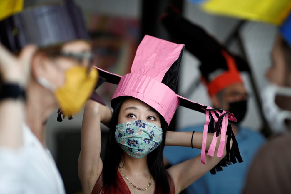 在巴黎的 59里沃利美術館(59 Rivoli gallery)內,藝術家們戴上仿宋朝官員的帽子,維持防疫社交距離。