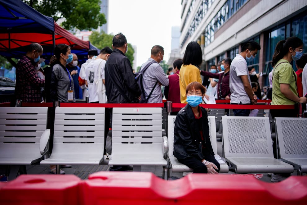 在COVID-19(武漢肺炎)疫情爆發的湖北省武漢市,民眾紛紛戴起口罩排隊等待篩檢。