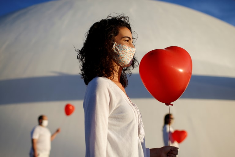 在巴西首都巴西利亞(Brasilia),藝術家手拿紅色氣球,悼念在COVID-19(武漢肺炎)中死去的病患。