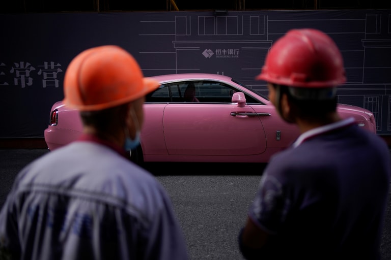在中國上海,兩名建築工人凝神看著對街一台粉紅色的勞斯萊斯。