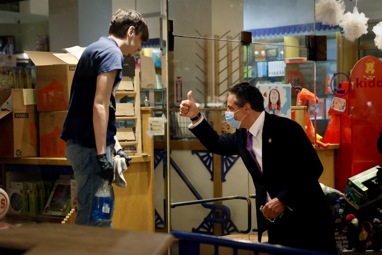 6月9日這天,美國紐約市啟動第一階段重新開放措施,紐約州州長古莫(Andrew Cuomo)朝一名正在打掃紐約中央車站(Grand Central Terminal)裡一間玩具店的店員比出大拇指,感謝他的付出。