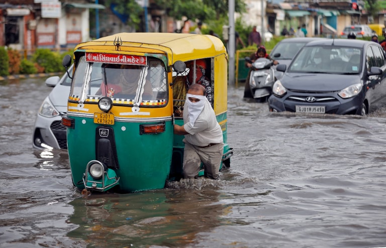 在印度第七大城艾哈邁達巴德(Ahmedabad),連日大雨使當地街道淹起大水,一名男子在大水中,艱難地推著他的電動嘟嘟車。