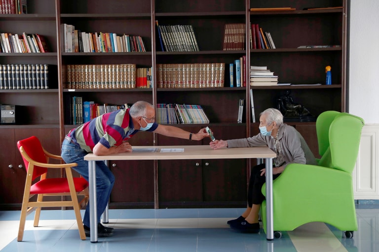 6月8日這天,是西班牙馬德里近郊納瓦爾卡爾內羅 (Navalcarnero)的Centro Casaverde安養院三個月以來,首度開放家人探視院內居民。梅約(Jesus Mayo)伸長手遞過手機,讓媽媽阿貝拉(Vicenta Abella)有機會和好久不見的家族成員講講話。