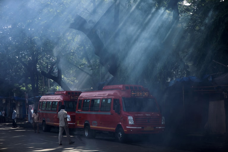 在印度的孟買(Mumbai),消過毒的街道旁停著兩台公車。目前,印度總理莫迪(Narendra Modi)已經開始逐步放鬆印度的封鎖令管制,大眾交通工具已經可以重新回到街道上服務旅客。