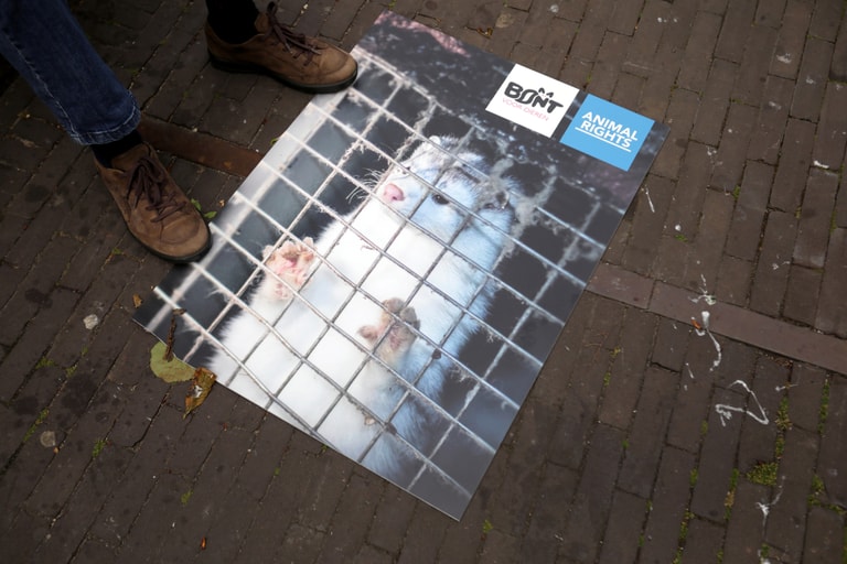 在荷蘭海牙(Hauge)一場呼籲終結皮草貿易的抗爭中,攝影師拍下地上一張印著水貂的活動海報。近日,荷蘭政府宣布採取行動,著手淘汰國內不合格的水貂養殖場。