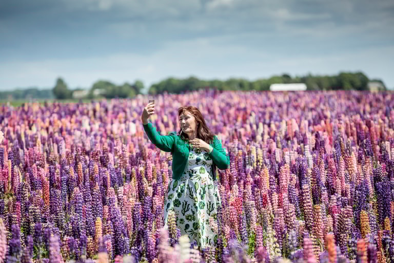 在丹麥第四大島洛蘭島(Lolland)上,一名女性拿起手機,拍下自己站在魯冰花(Lupinus-plants)花田中的美麗身影。