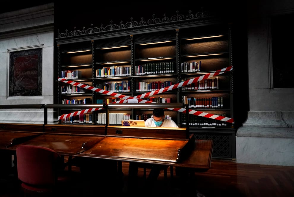 在西班牙首都馬德里的西班牙國家圖書館(Spanish National Library),一名戴著口罩的男子正埋首書堆當中。
