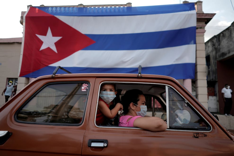 在古巴首都哈瓦那(Havana),一位媽媽開車載著小男孩經過國旗前面,小男孩好奇地從窗外探出頭來觀望四周。