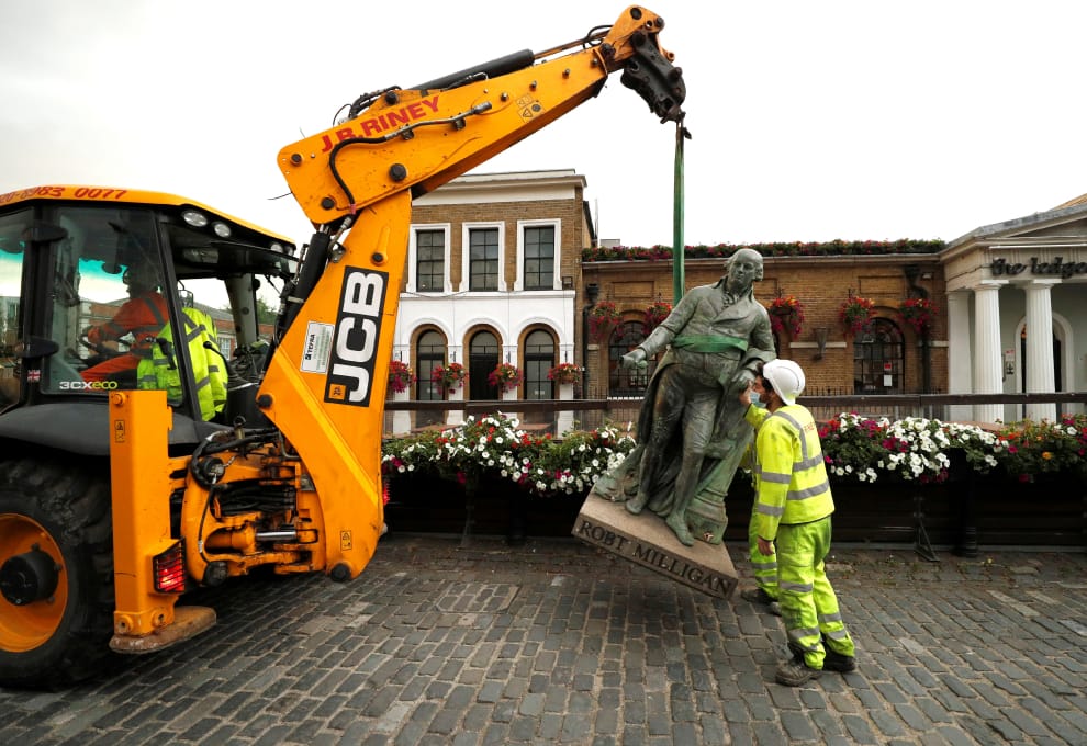 在英國倫敦,倫敦碼頭區博物館(Museum of London Docklands)前的一尊米利甘(Robert Milligan)雕像被工人移除。