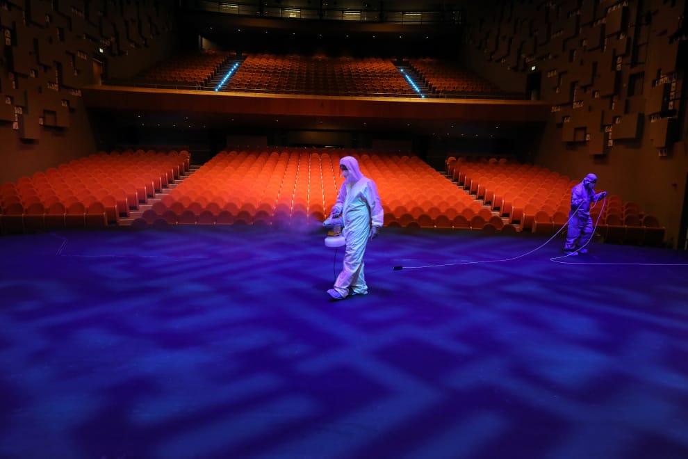 在賽普勒斯的首都尼克西亞(Nicosia),一名市政府的員工穿著全套的防疫裝備,替尼科西亞市立電影院(Municipal Theatre of Nicosia)消毒。