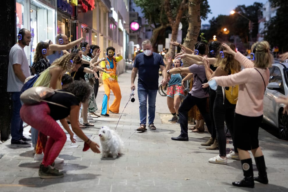 在以色列的特拉維夫(Tel Aviv),一名男子牽著狗,接受一群「無聲迪斯可」(silent disco event)參加者的熱烈歡迎。