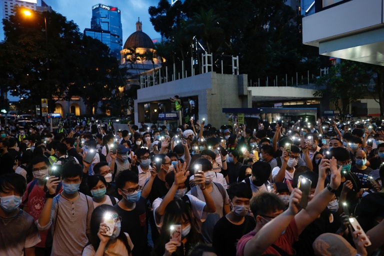 在香港,反政府示威者們高舉手機,點亮手電筒,紀念香港的示威遊行活動屆滿一周年。