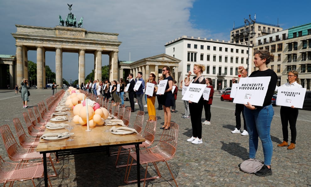 在德國柏林的布蘭登堡門(Brandenburg Gate)前,婚禮產業的從業人員布置起空蕩蕩桌椅及餐盤,抗議德國政府對他們下達的嚴格管制措施。