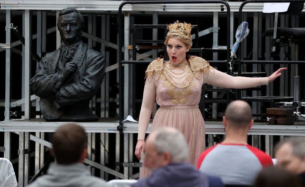 演出前,歌劇演唱家施利赫特(Annika Schlicht)穿上表演服進行彩排,演唱華格納(Richard Wagner)的作品《萊茵的黃金》(Das Rheingold)。根據主辦方的說法,這場表演將是德國開始放鬆封鎖令管制後的第一場歌劇表演。