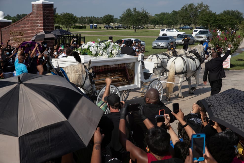 在美國德州皮爾蘭(Pearland),馬車拉著黑人男子佛洛伊德(George Floyd)的棺材進入休士頓紀念花園(Houston Memorial Gardens),準備將他安葬於此。