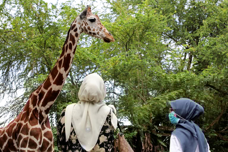 近期,位於馬來西亞首都吉隆坡(Kuala Lumpur)的馬來西亞國家動物園(Malaysia National Zoo)重新對外開放,兩名遊客走到長頸鹿園區,抬頭看著長頸鹿。