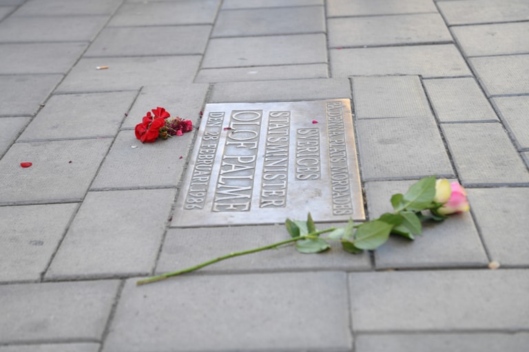 在瑞典斯德哥爾摩(Stockholm)街頭,人們在 34年前瑞典前首相帕爾梅(Lisbet Palme)遭刺殺的地點,獻上花朵悼念。