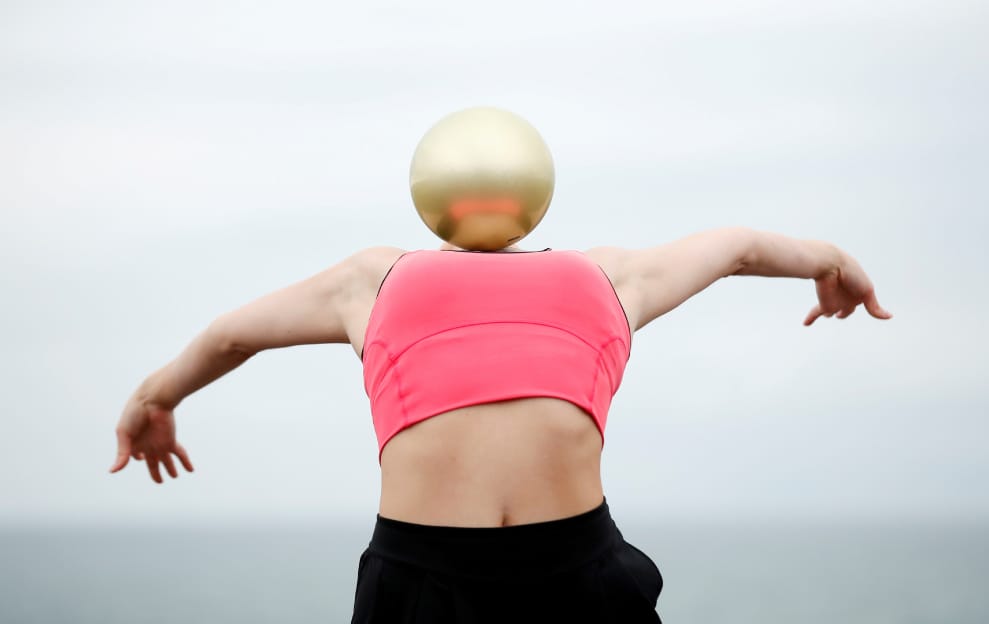 在英國霍夫(Hove)海邊,韻律體操選手哈契森(Lynne Karina Hutchison)正在進行日常訓練,有一瞬間,訓練用的金色球看起來像意外取代了她的頭。