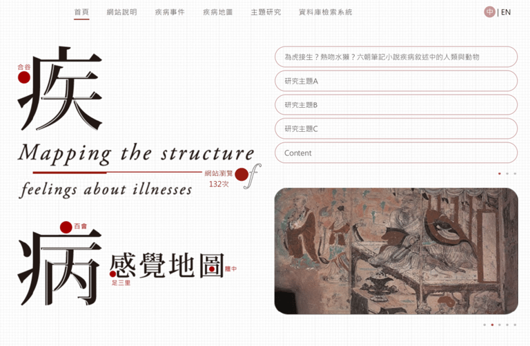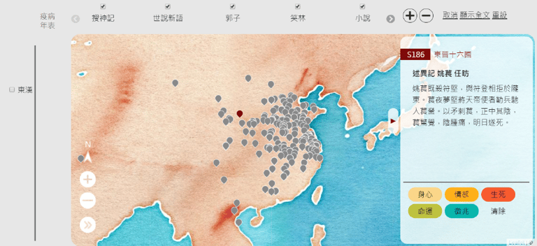 具體活生生的疾病感受,需要細讀文學裡的隻字片語;集合勾勒出的時代氣氛,則要大量文本的遠讀。劉苑如團隊耗費三年,彙整三十五本六朝小說、四本僧傳文本,結合數位人文方法建立了「疾病感覺地圖」網站。