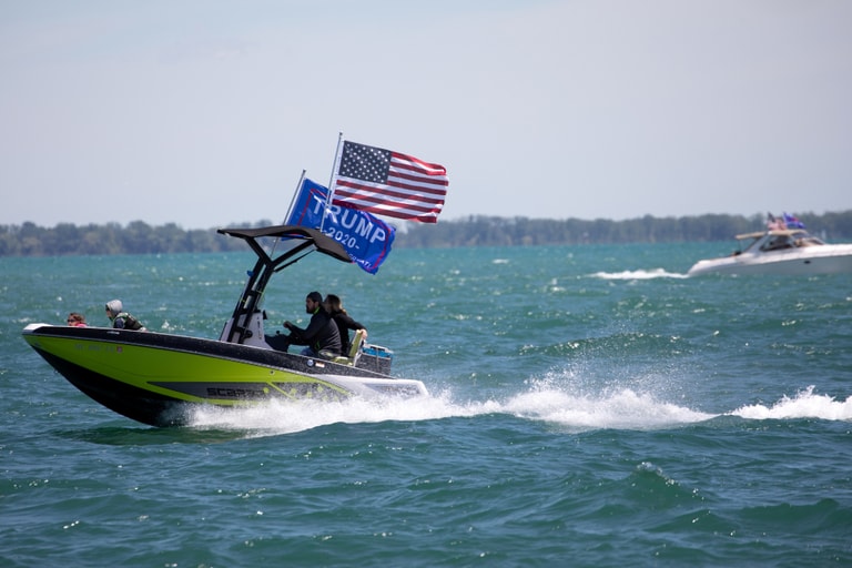 在密西根州的聖克爾湖地鐵公園(St. Clair Metropark)中,美國總統川普(Donald Trump)的支持者駕上「讓美國再次偉大」旗子的小艇在水面上馳騁,慶祝川普的 74歲生日。