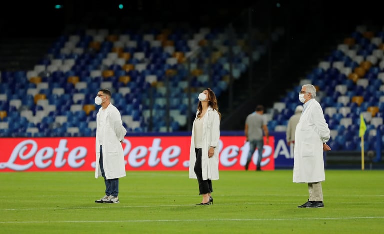在義大利那不勒斯(Naples)的聖保羅球場(Stadio San Paolo)的閉門賽事開賽前,醫護人員站在賽場上,與球員和收看轉播的觀眾一起默哀一分鐘,悼念在COVID-19(武漢肺炎)中離世的病患。