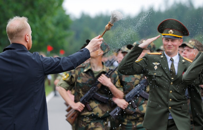 在白羅斯的鮑里索夫(Borisov),士兵們在基地完成宣誓後,由東正教的神父替他們灑聖水祝福。