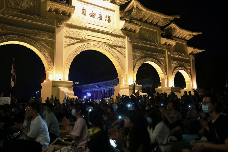 在台北的自由廣場,支持香港反政府示威的民眾聚集在此,紀念該活動已經屆滿一周年。