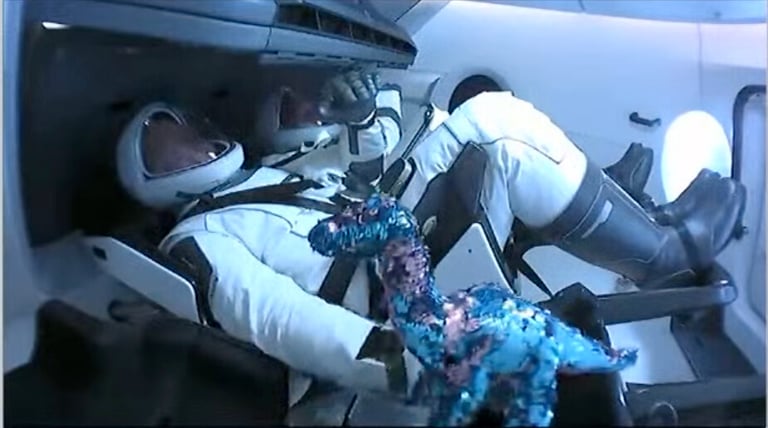 在這回SpaceX的太空任務中,兩名太空人奉兒子們的命令,將一隻玩具恐龍一起帶上太空。不過,這隻恐龍並非只有紀念價值,在兩人進入太空後拍攝的影片中,這隻漂浮的恐龍被用來證實兩人已到達太空,算是發揮一點小小的貢獻。