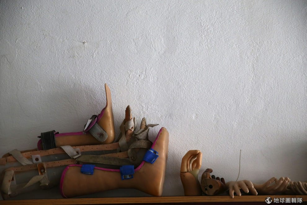 當地的扶助中心中擺滿做好的義肢,這些義肢主要提供給戰爭中失去手腳的難民,義肢的原料來自戰爭中的武器碎片、水桶、或是人體模型