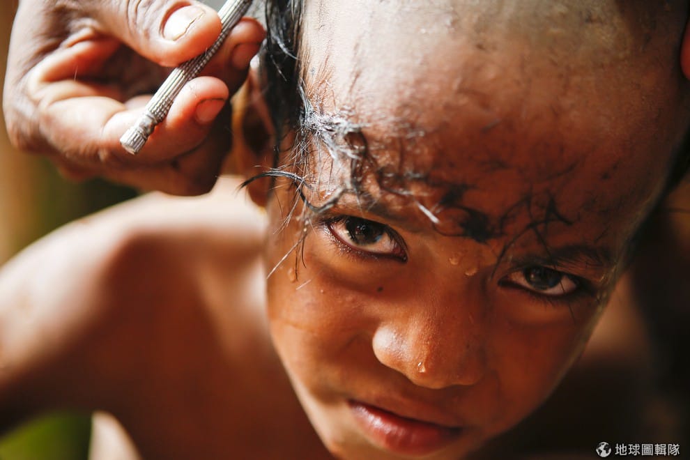一名小男生在當地的佛教慶典開始前,正在接受剃髮的儀式