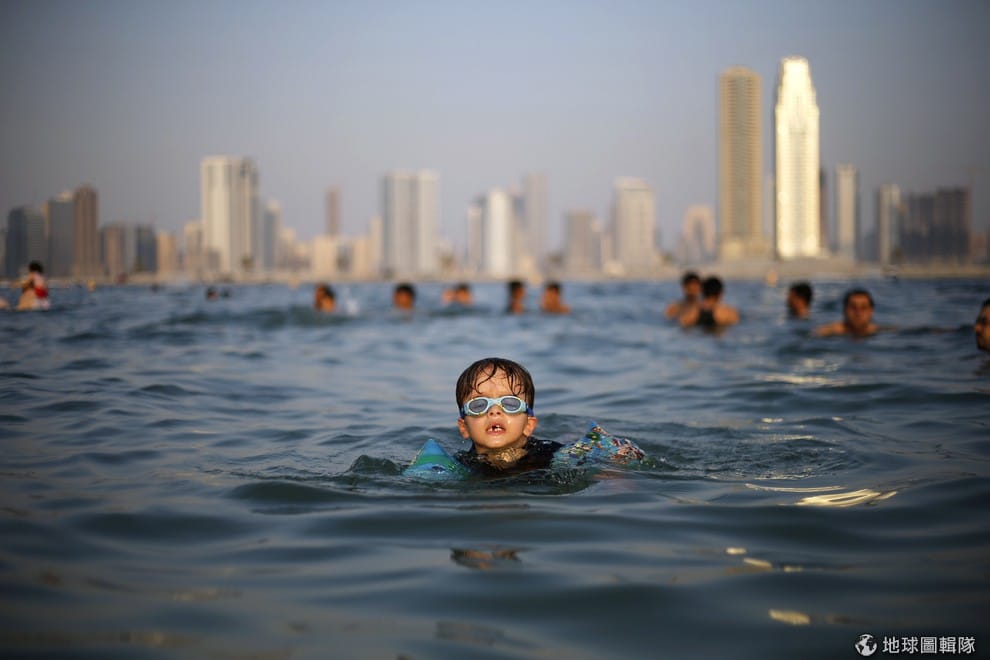 一名孩童正享受海邊戲水風光