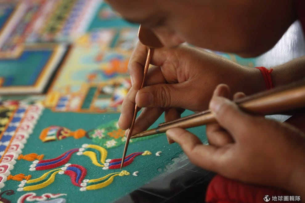 Drepung Loseling修道院內一名西藏籍的喇嘛正在織具有宗教意涵的曼達拉(Mandala),當曼達拉完成後喇嘛會把這項織品獻給民眾象徵祈福,以及頌揚心靈生活的美好,這間修道院因為中國入侵西藏後,遷址到了南印度境內