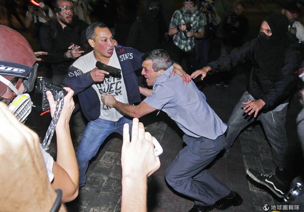 一名便衣刑警(左)正試圖從抗議團體中救出警察同夥,當地的抗議團體正在要求政府降低大眾交通系統的價格