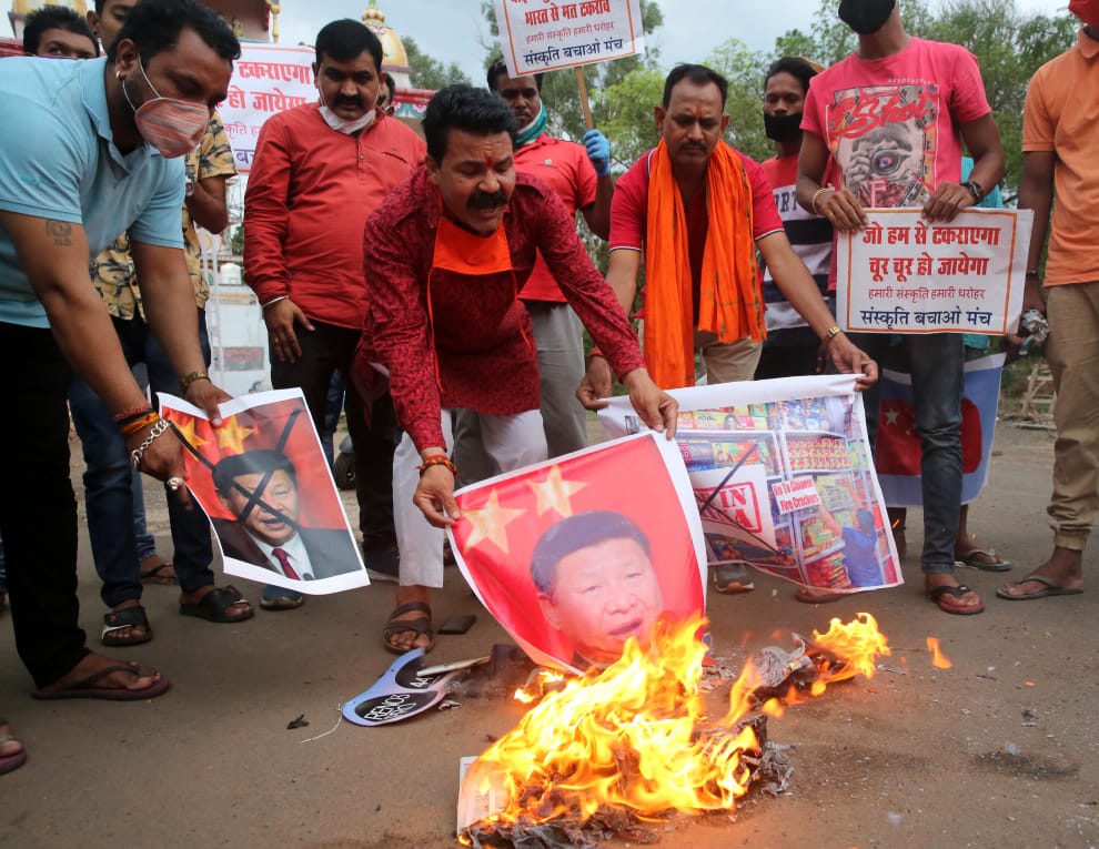 16號這天,在印度中央邦首府博帕爾(Bhopal),抗議中國侵犯邊界的印度民眾火燒中國領導人習近平的照片。