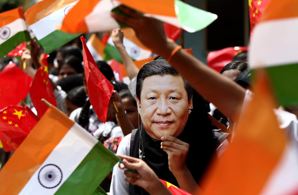 2019年10月10日,位於印度東南部欽奈市(Chennai)的民眾手舉印度和中國國旗,歡迎中國領導人習近平的造訪。兩國關係在這次的邊界衝突後會怎麼發展,是國際社會關注的焦點。