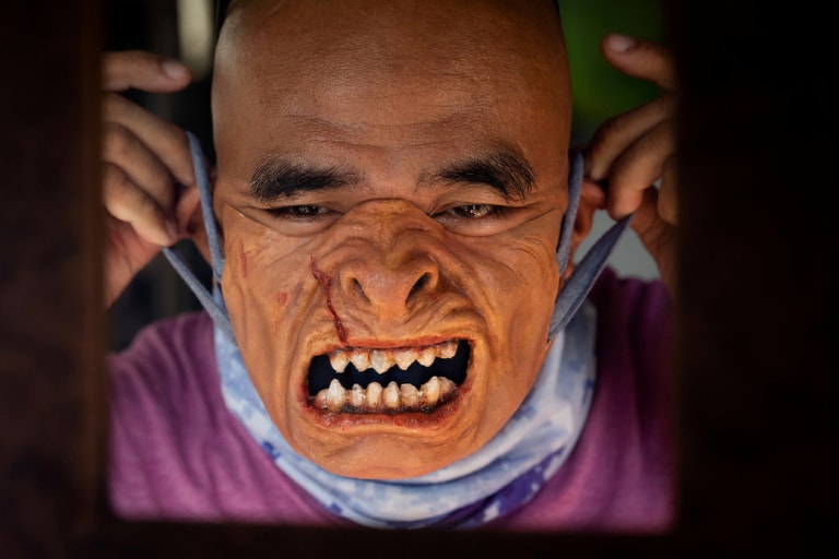 在菲律賓首都馬尼拉近郊的聖佩德羅(San Pedro),特效化妝師阿貝拉多(Rene Abelardo)正在試戴新完成的一副口罩。受到COVID-19(武漢肺炎)疫情影響,許多劇組的工作都被迫喊停,在此期間,阿貝拉多將注意力轉到彩繪口罩上,創作出許多新作品。