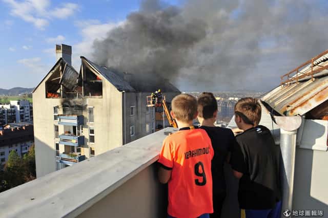 小男生們站在屋頂上看著遠處燃燒的民房以及緊急打火的消防隊員