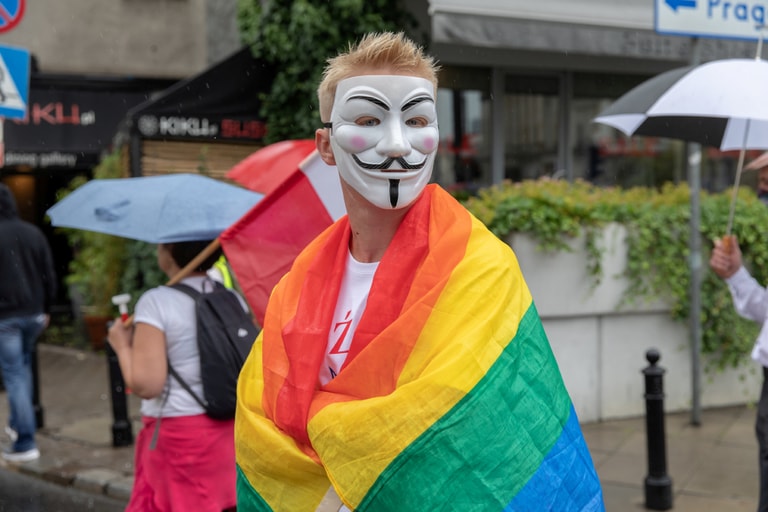 在首都華沙,戴著V怪客面具的民眾身披彩虹旗參加反政府示威遊行,抗議波蘭總統杜達(Andrzej Duda)稱促進LGBT權利是比共產主義還具破壞性的「意識形態」。