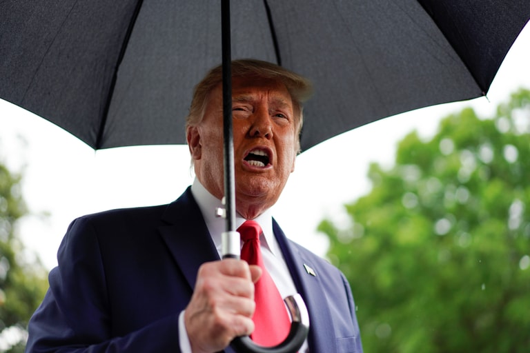 在準備從白宮出發前往位於奧克拉荷馬州塔爾薩市(Tulsa)的總統大選造勢活動前,美國總統川普(Donald Trump)撐著傘接受記者的訪談。
