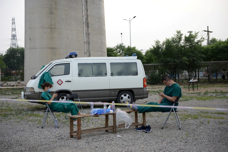 在爆發第二波COVID-19(武漢肺炎)疫情的北京,醫護人員在檢測站旁稍事休息,準備待會幫北京市民大量篩檢。