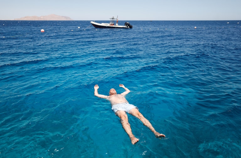 在緊鄰阿卡巴灣(Aqaba Gulf)的紅海渡假村,一名觀光客漂浮在藍海上享受陽光與透心涼的海水。